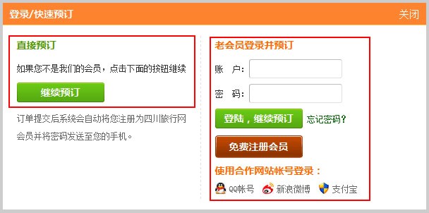 之后会弹出提示登陆页面(已登陆的会员会跳过此步),你可以选择直接预定或者是使用会员账号登陆后预定。如您还没有我们的会员账号请先3秒钏注册会员,注册会赠送100元现金哦!