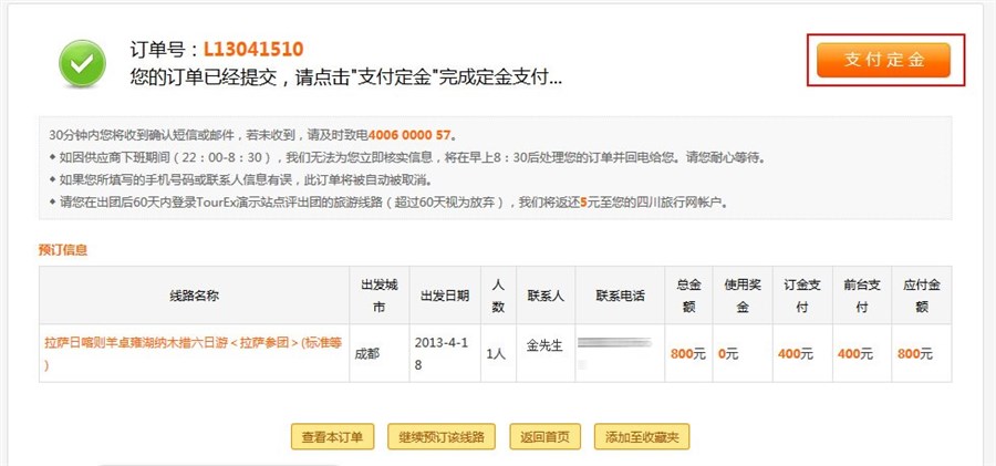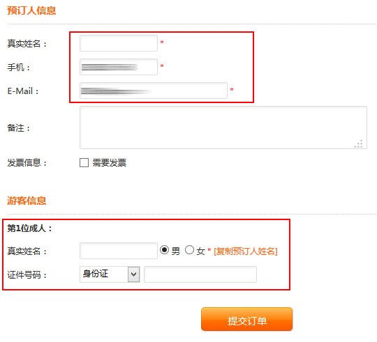 进入后会看到预定产品名称,日期,价格,数量等信息。在下面输入预定人的资料即可提交订单。