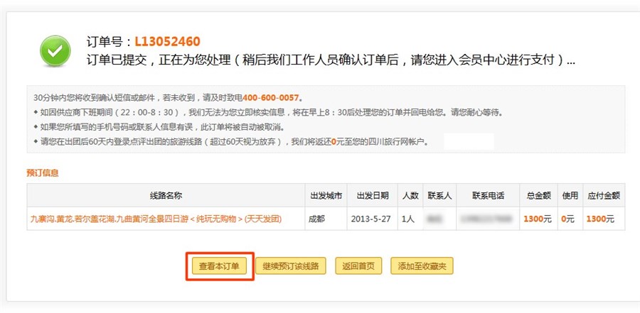 1.当您成功提交订单后,会提示出现以下内容,点击下面的”查看本订单“按纽进入订单中心。