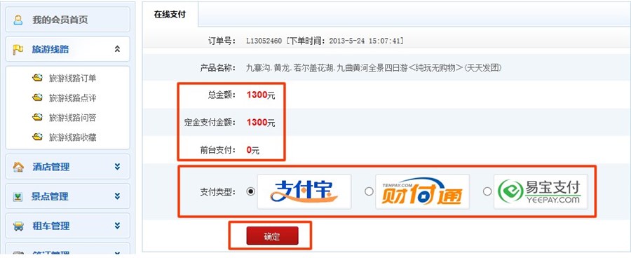 3.进入选择支付方式页面,在些选择您想要的支付方式接口,目前可能为您提供三种接入方式(分别支付宝、易宝支付、财付通)。请下面确认你的支付信息后选择支付接口进入下一步流程。(在此以选择支付宝为例)