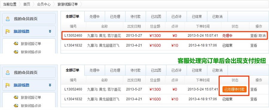 2.进入个人会员的订单中心后,会看一自己的产品订单列表。当下单成功后订单还处于客服处理阶段(当前状态显示为“处理中”),当我们的客服人员为您处理完成该订单后(当前状态显示为“已处理待付款”),您就可以进行支付操作了。点击引按纽进入下一步操作流程。