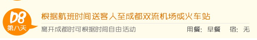 今日自由活动,您可闲逛一下成都,宽窄巷子、锦里、春熙路,体验成都的历史文化,搜罗成都的美食。送机师傅会和您约好送机时间,请您掌控好,以免误机。